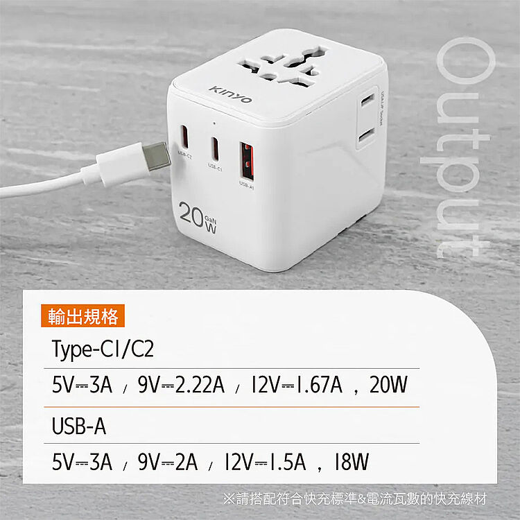 USB孔+2孔Tpye-C充電埠,最高輸出20W