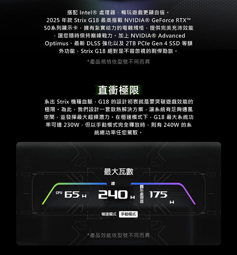 LCD 18" 16:10(薄邊框) / 2.5K (2560 x 1600, WQXGA) 16:10 / 240Hz / IPS-level / 3ms / DCI-P3 % 100% / G-Sync / Pantone 認證 / Anti-glare / Dolby Vision HDR / ROG Nebula Display / 1080P FHD IR Camera