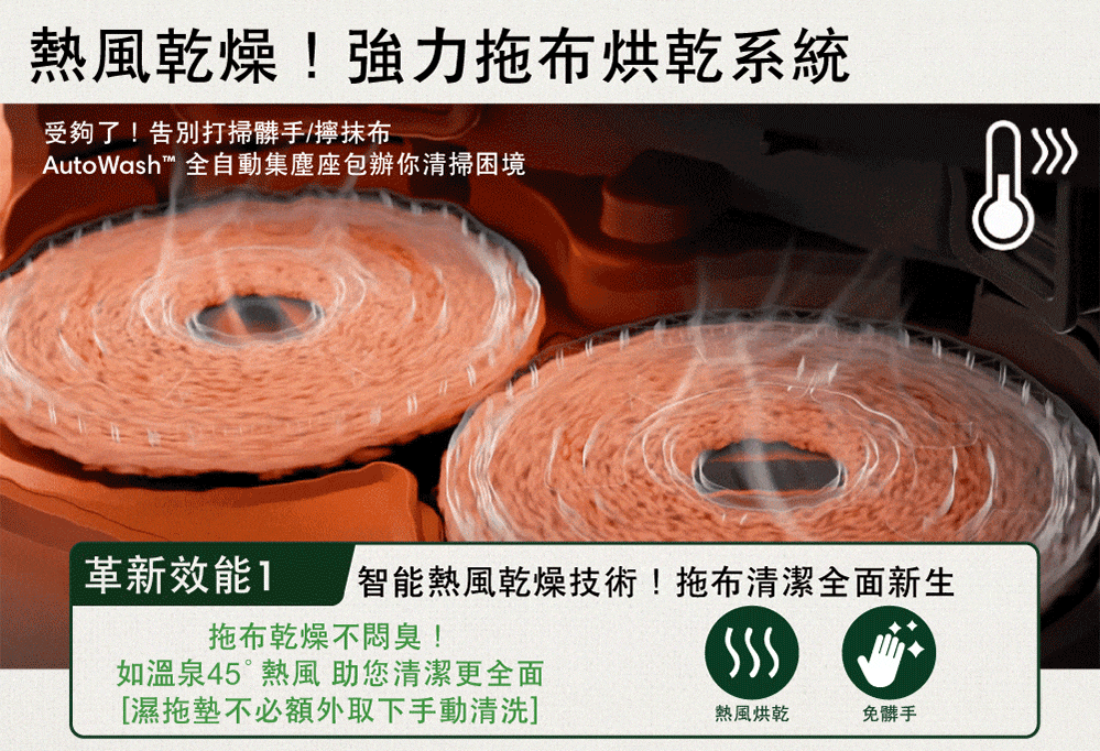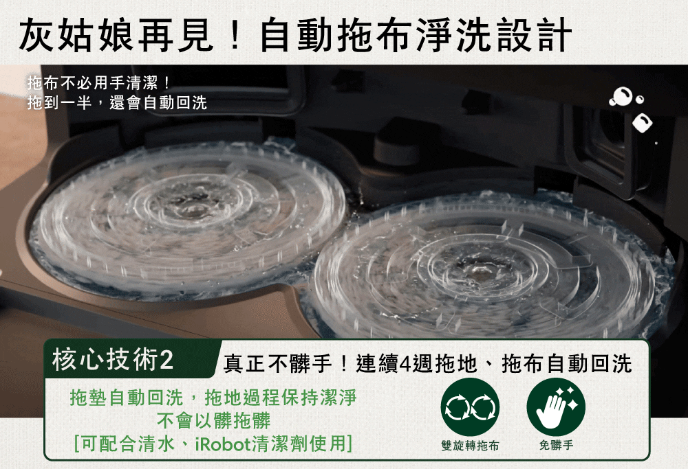 ■ 雙旋轉濕拖墊(每分鐘旋轉200次+遇地毯自動抬升1cm)