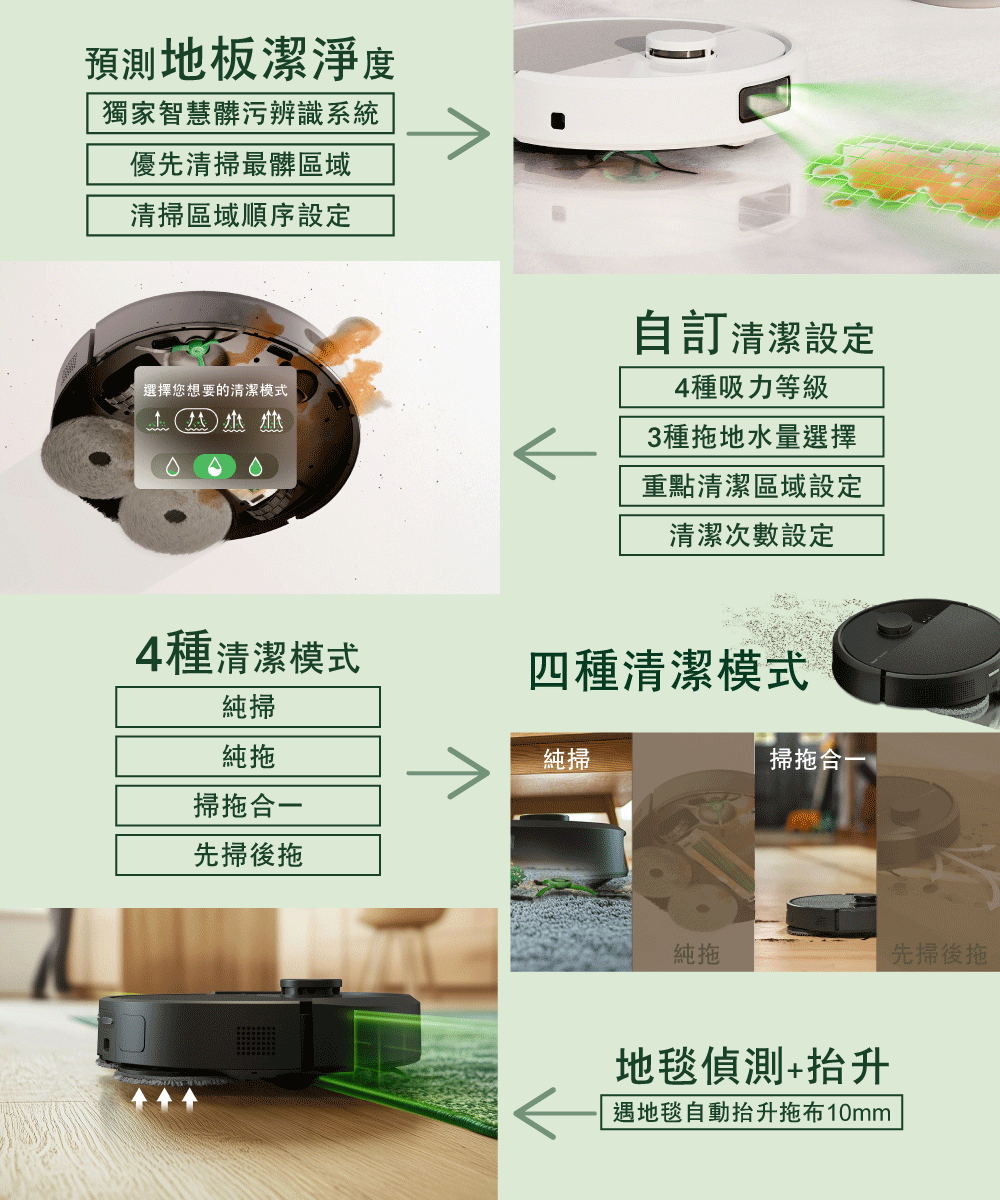 ■ 4 種清潔模式 (掃拖併行, 純掃地, 純拖地 ,先掃後拖)