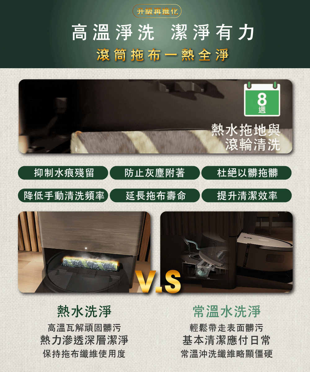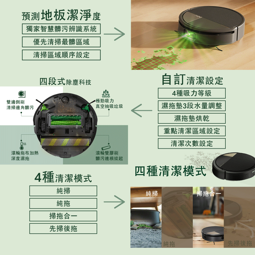 ■ 4 種清潔模式 (掃拖併行, 純掃地, 純拖地 ,先掃後拖)