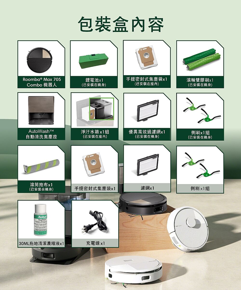 Roomba Max 705 Combo AI滾筒活熱水熱風旗艦機皇掃拖機器人功能