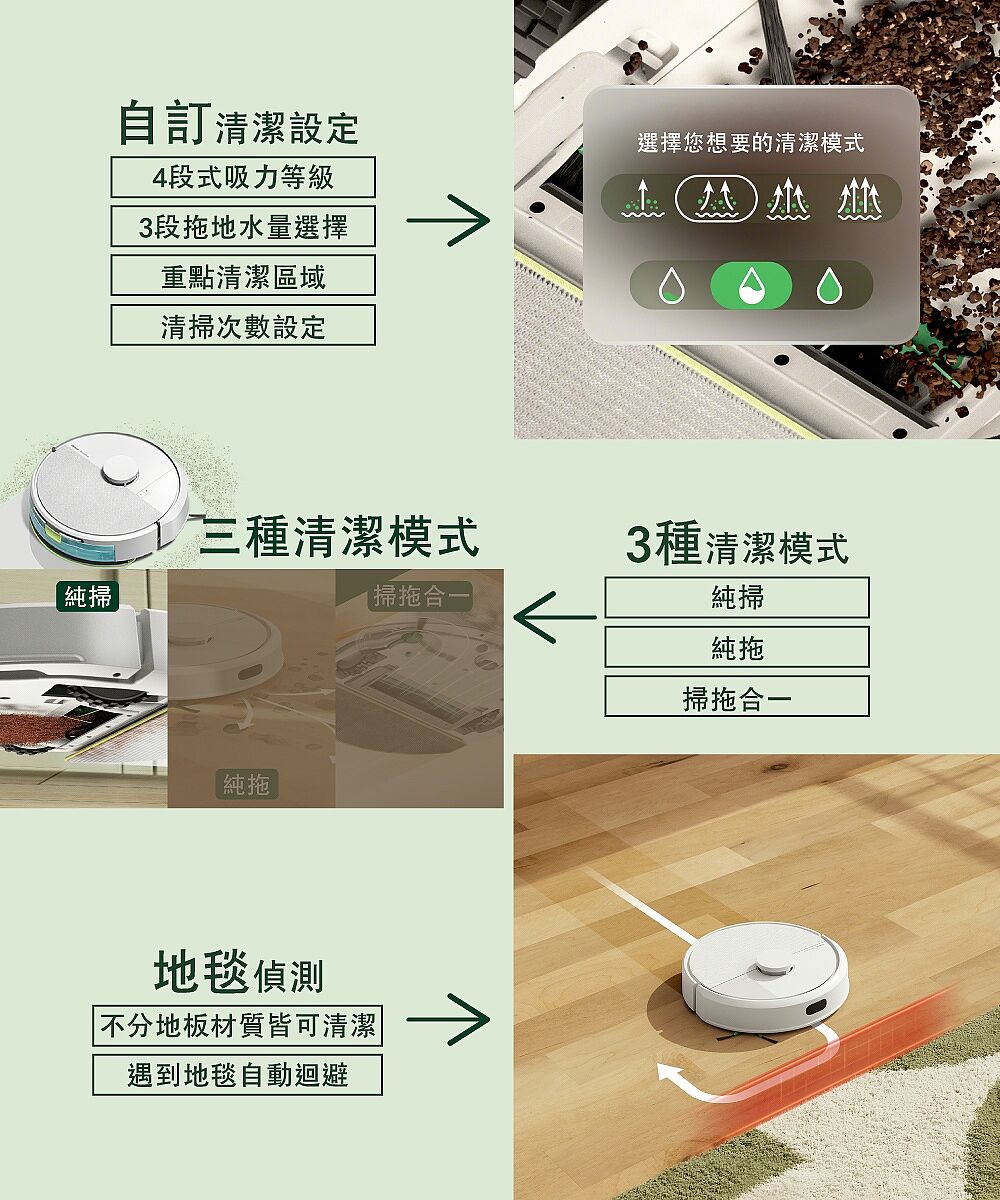 ■ 3 種清潔模式 (掃拖併行, 純掃地, 純拖地)