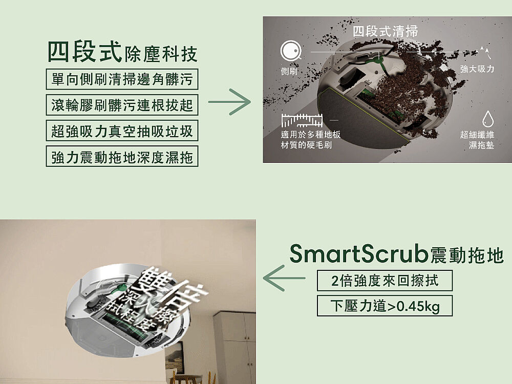 ★注意: 掃地模式可跨越1.5 cm 門檻或地毯 拖地模式可跨越1.1 cm門檻(誤差範圍正負0.2公分, 需以實際情況而定,有疑問可先詢問 )