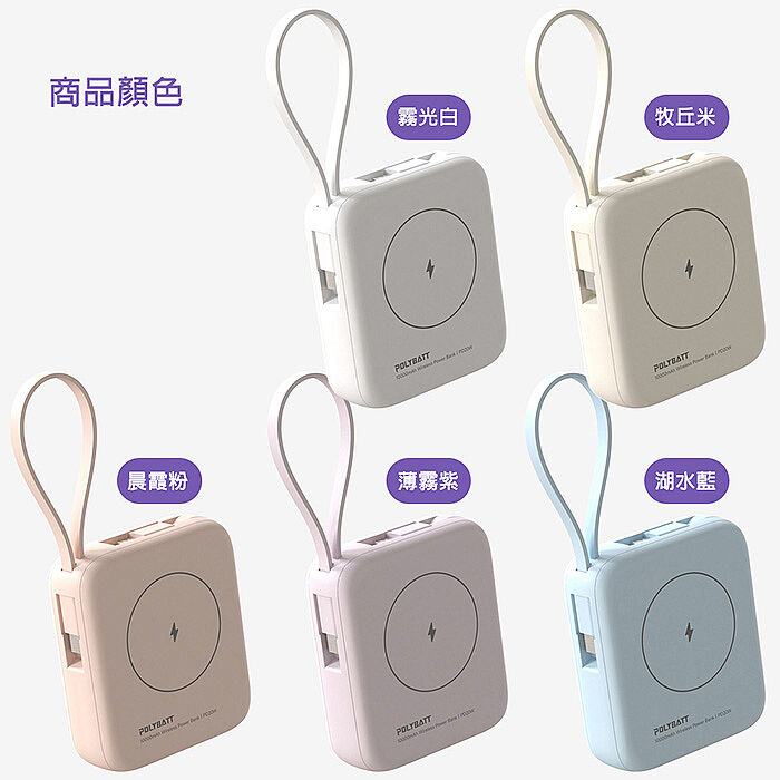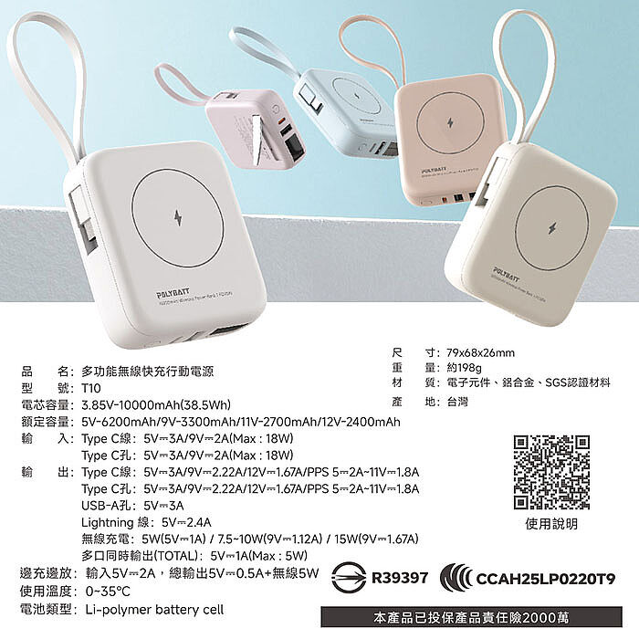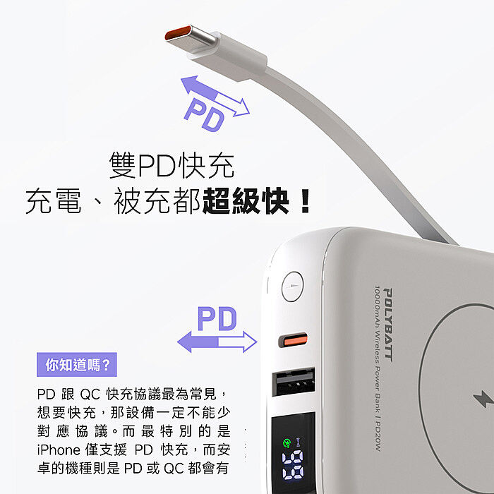 Polybatt 台灣製造 10000mAh 20W 自帶雙線/數顯/磁吸無線快充行動電源(T10)