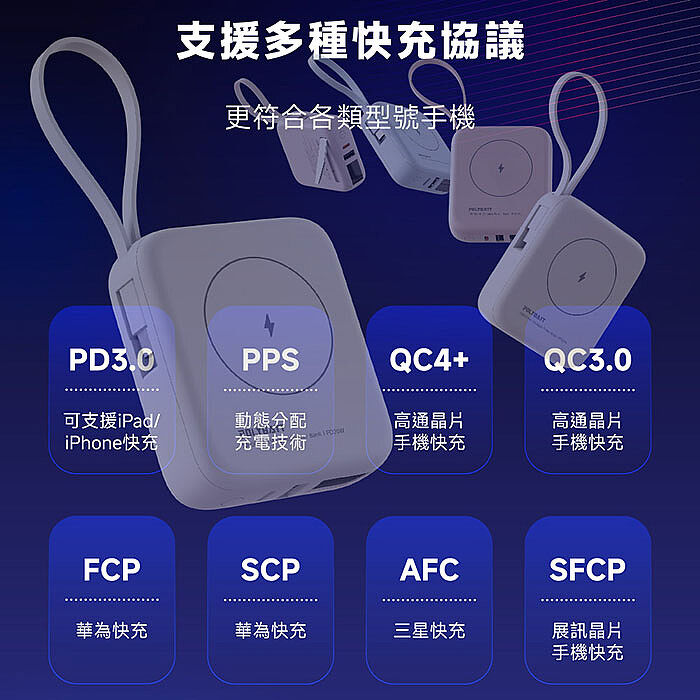 ◎ 快速雙向充電,具備電量指示燈。強力磁吸,無線充電不怕掉,支援全協議快充