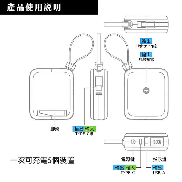 ◎ 自帶Type C+Lightning雙充電線,外出攜帶方便,可同時輸出五項設備