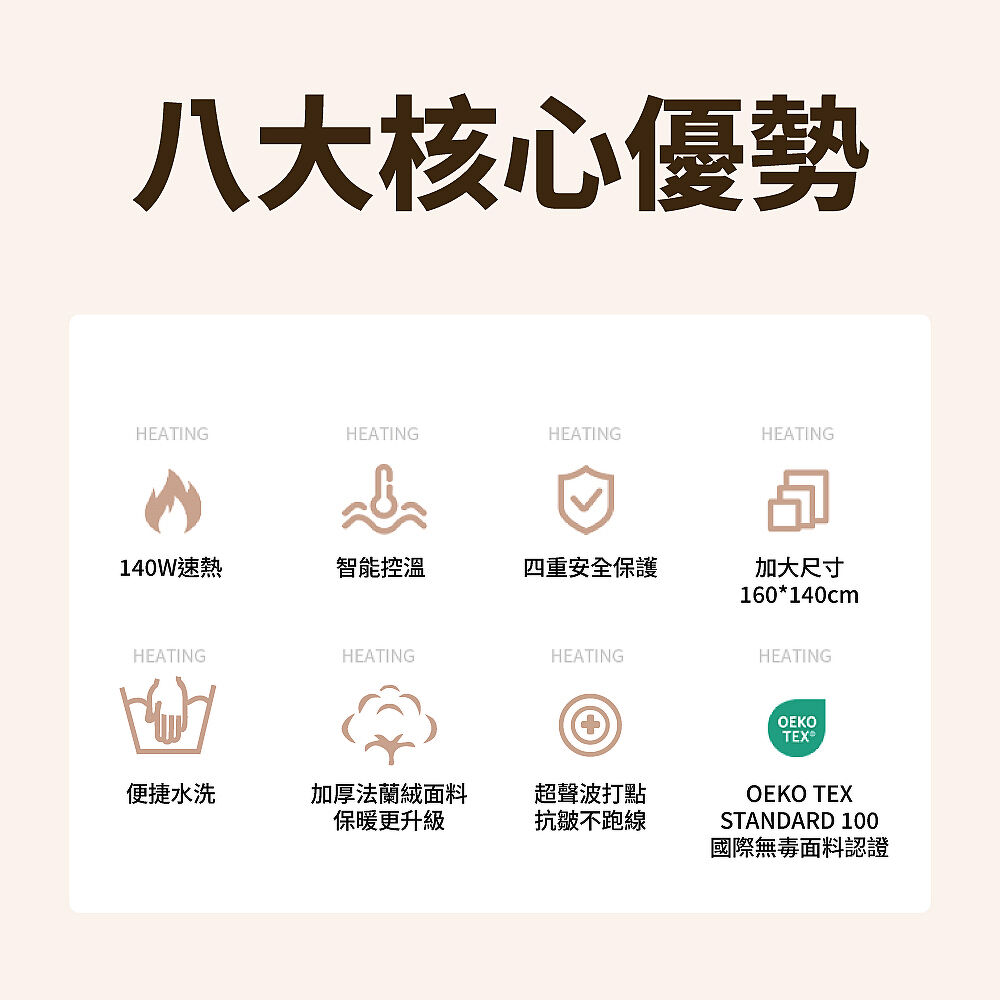 160 x 140 cm超大尺寸,全面暖活,舒適睡眠設計