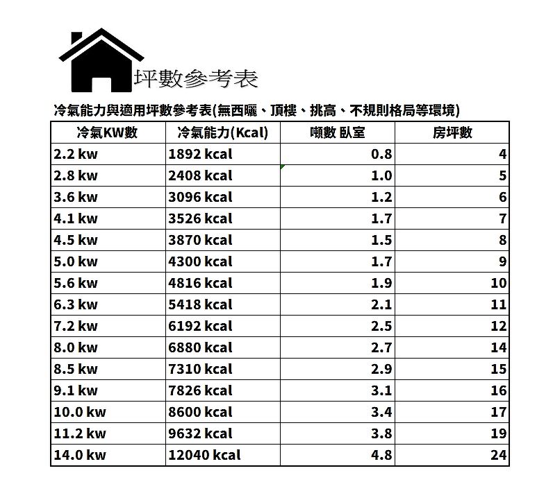 | 冷氣能力單位換算:1kw=860kcal/h |