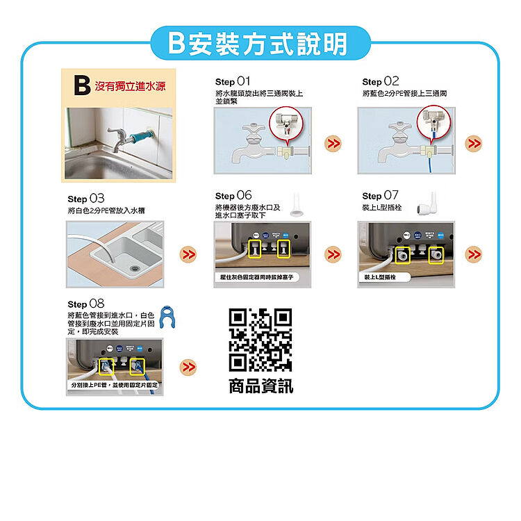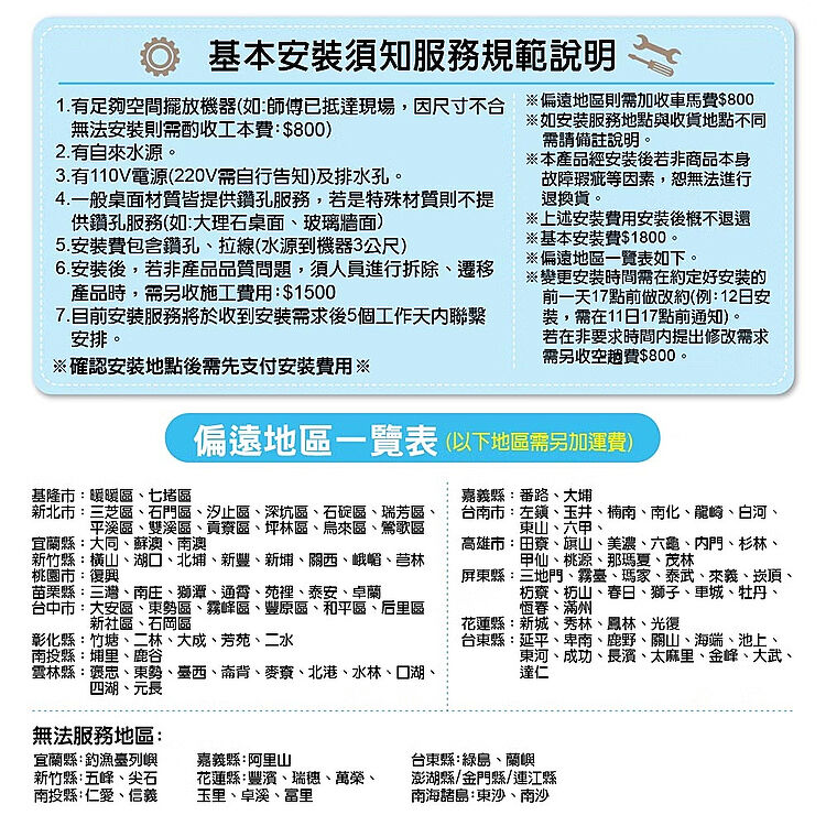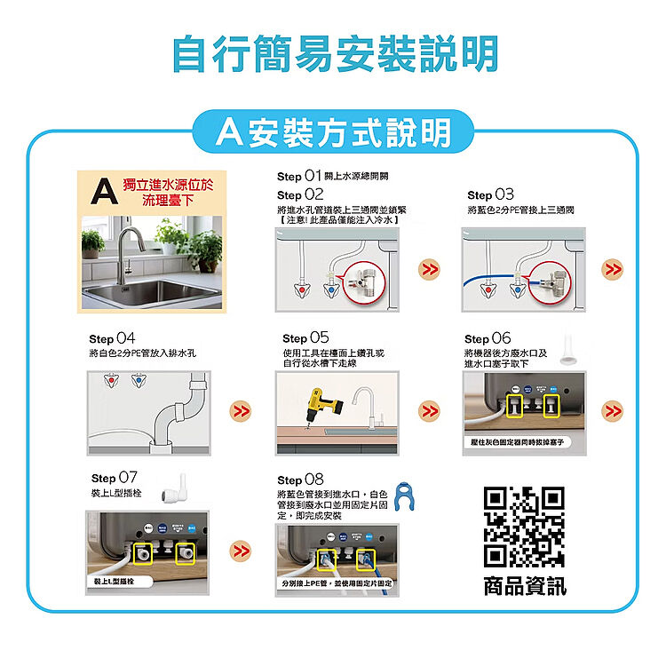 配件:主機掛版*1,螺絲*4,接水盒*1,2分L型插栓*4,膨脹管*4,2分PE管4m(白色、藍色)x1