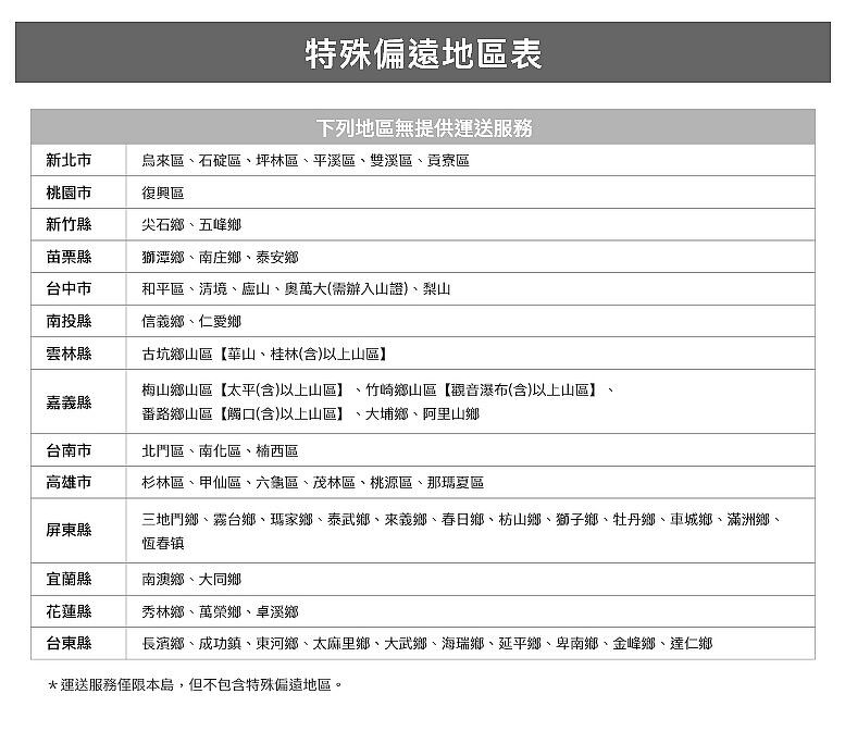 ◎只限台灣本島配送,外島/離島地區無法配送。若配送、安裝地區屬:偏遠鄉鎮地區,或基隆、宜、苗、花、東、山區、需再酌收偏遠費用/跨區費,費用表如賣場文案中所示,各地超偏遠地區加價費用另議。