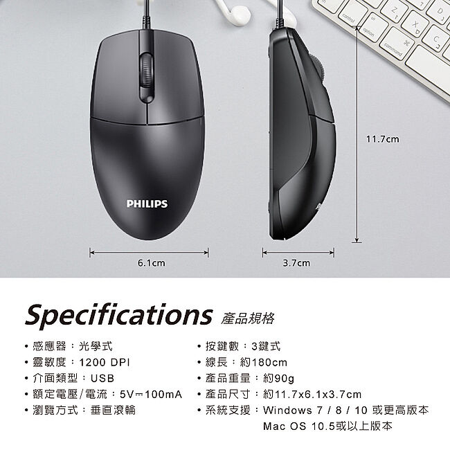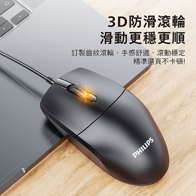 PHILIPS 耐用三百萬次點擊3鍵式有線滑鼠-SPK7247B
