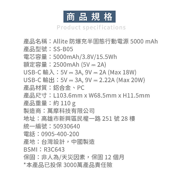 產品名稱:Allite 防爆充半固態行動電源 5000 mAh