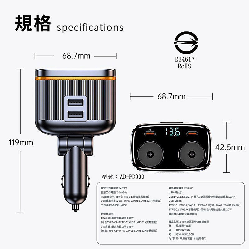 (包含Type-C1+Type-C2+USB1+USB2+雙點煙孔)