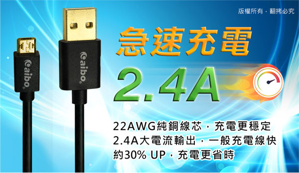 22AWG純銅線芯,2.4A急速充電,提升30%充電速度
