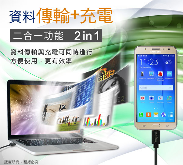 傳輸及充電功能二合一,連接電腦的USB端與手機、平板…等