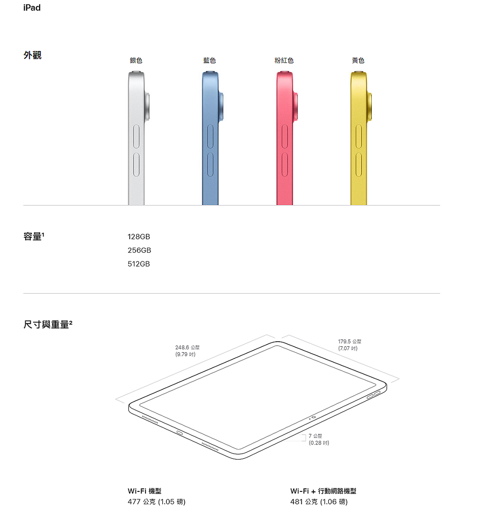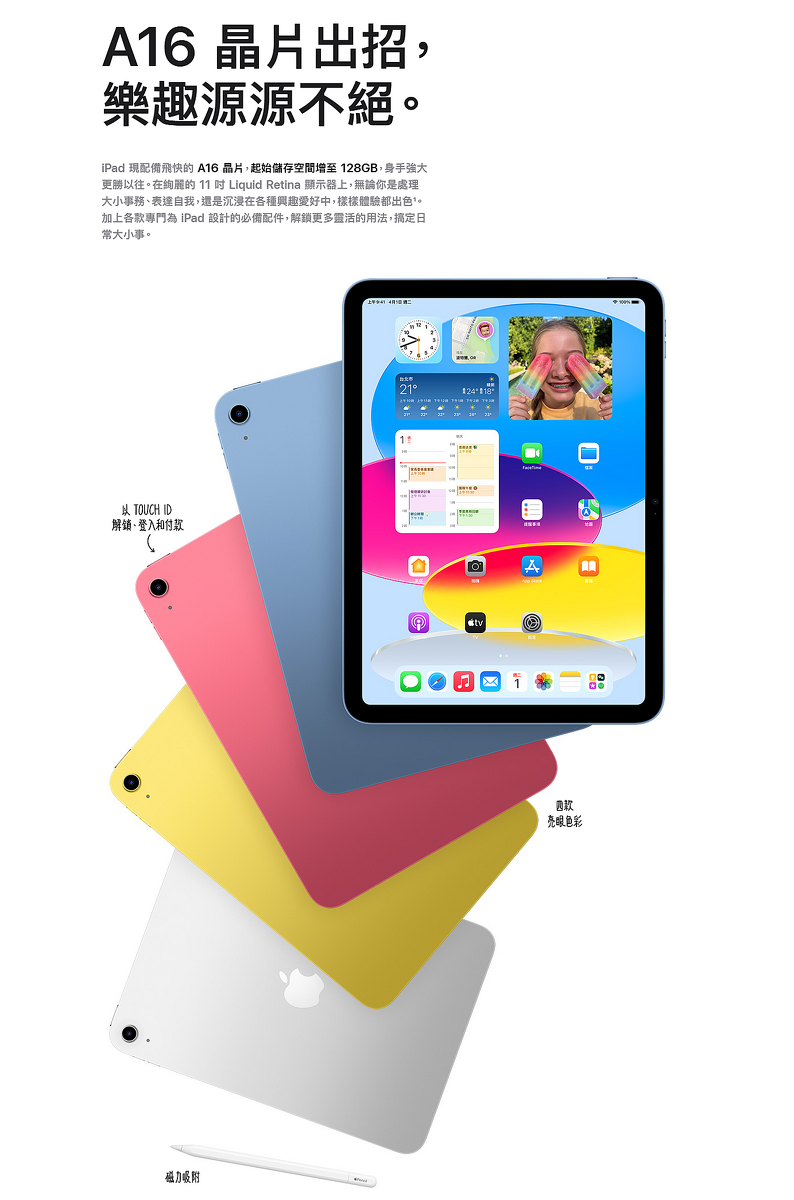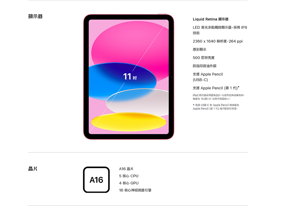 ● 可搭配 Apple Pencil (第 1 代) 、Apple Pencil (USB-C)與巧控鍵盤雙面夾使用*1.iPad 顯示器採用圓角設計。以矩形對角線量測時, 螢幕為 10.86 吋。實際可視區較小。*2.限行動網路機型
