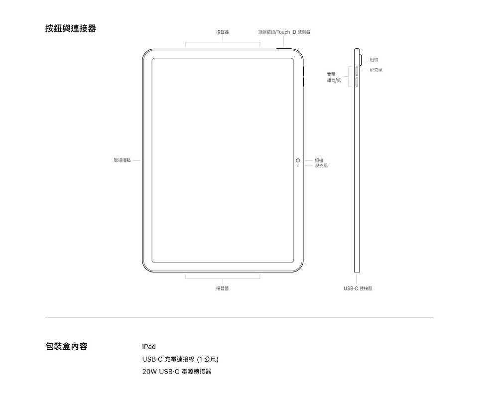 iPadUSB‑C 充電連接線 (1 公尺)20W USB‑C 電源轉接器