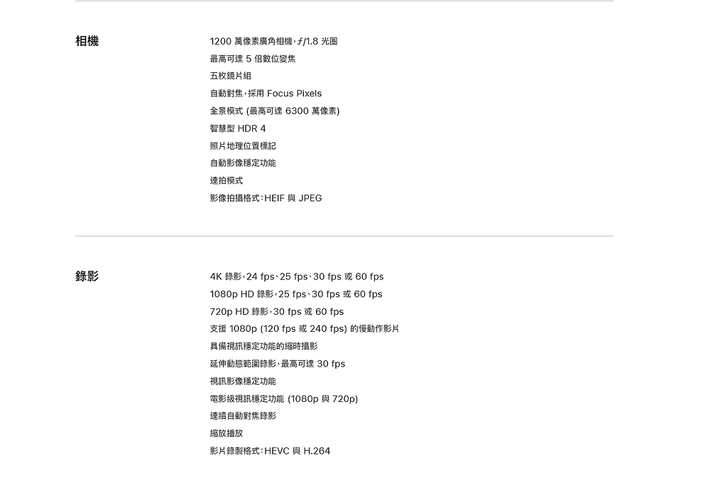 ● 1200 萬像素,ƒ/1.8光圈的廣角相機● 橫向1200 萬像素超廣角前置相機,具備人物居中功能