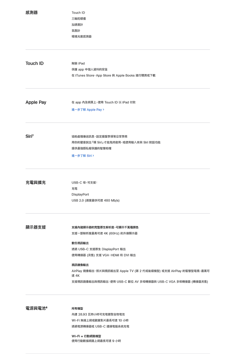 ● USB-C 連接器,可供充電與連接配件 (USB2.0)、DisplayPort● Touch ID,用於安全認證與 Apple Pay