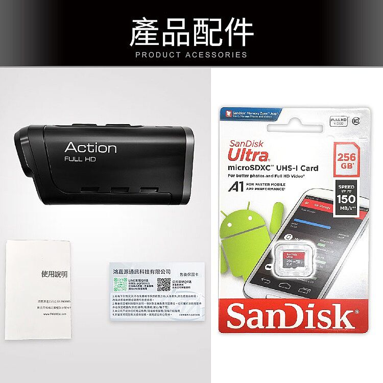 商品內容:主機x1/電源線x1/轉接架x1/安全帽支架x1/後視鏡轉接架x1/說明書x1/保固卡x1/SANDISK 256GBx1(增你強公司貨)