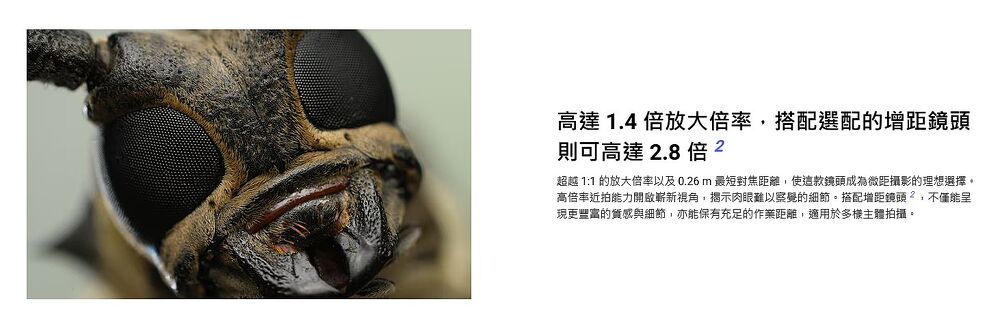 • 最大放大倍率 1.4 倍,使用增距鏡可高達 2.8 倍