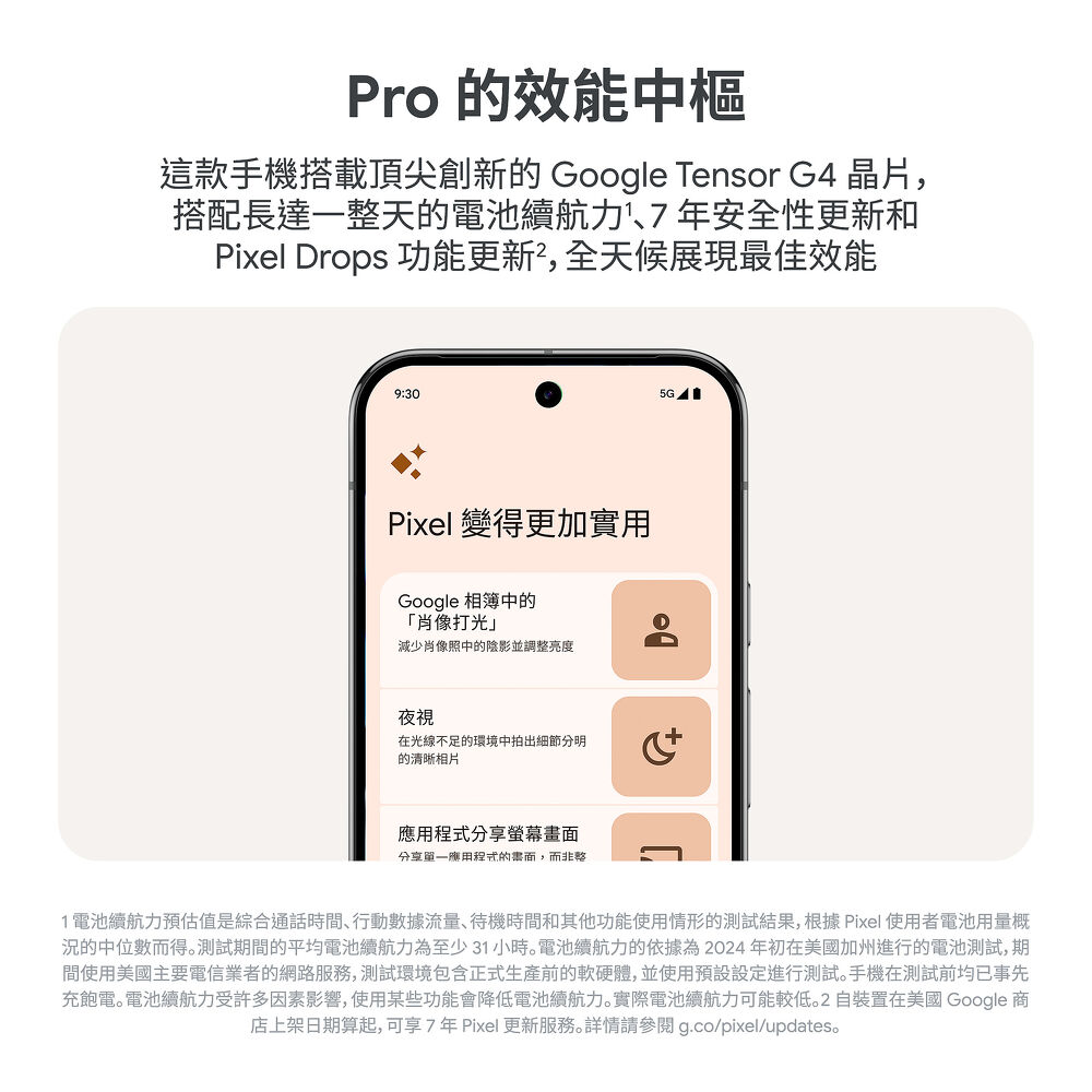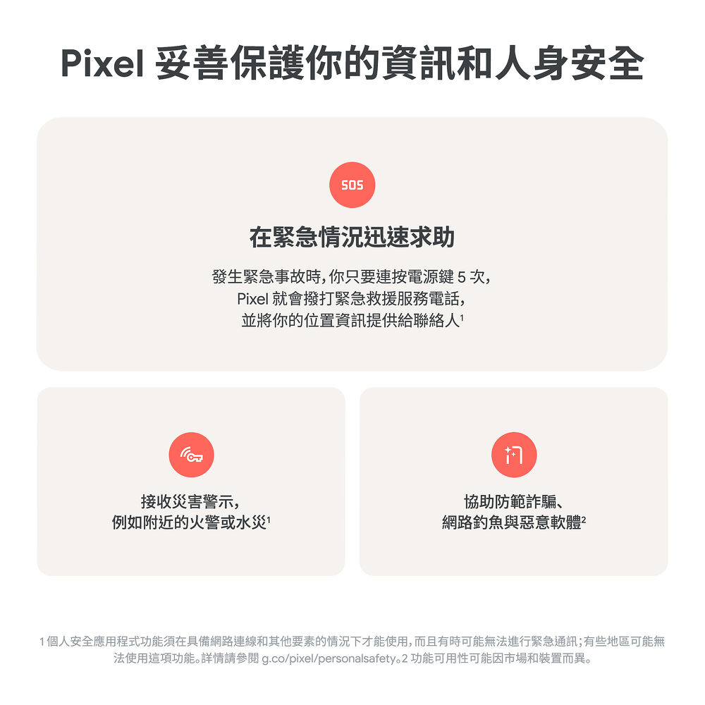 • 享有 7 年的 Pixel Drops 功能更新、作業系統及安全性更新服務