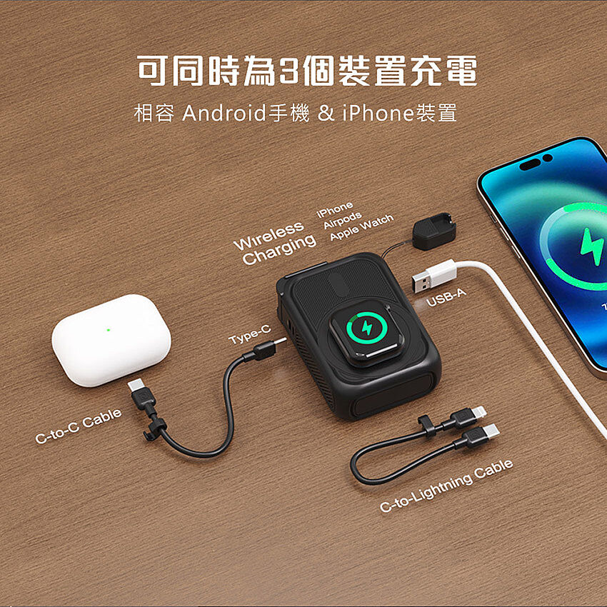 USB-C+USB-A+無線充電: 5V⎓3A(共享)+5W(無線充電)