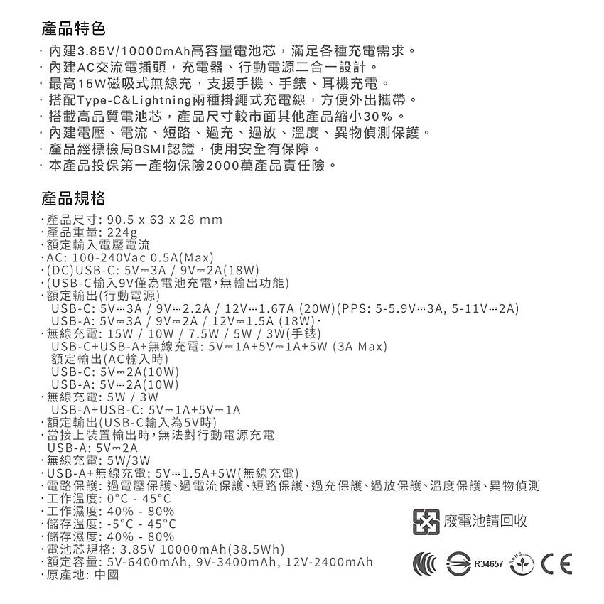 電池芯規格: 3.85V 10000mAh(38.5Wh)