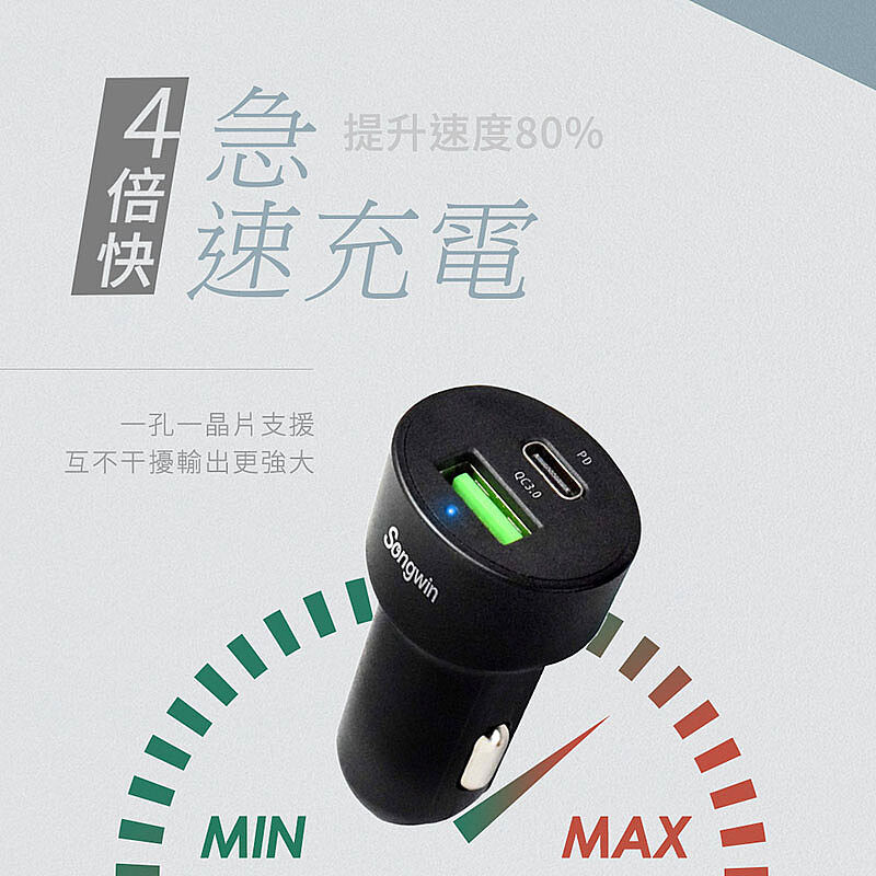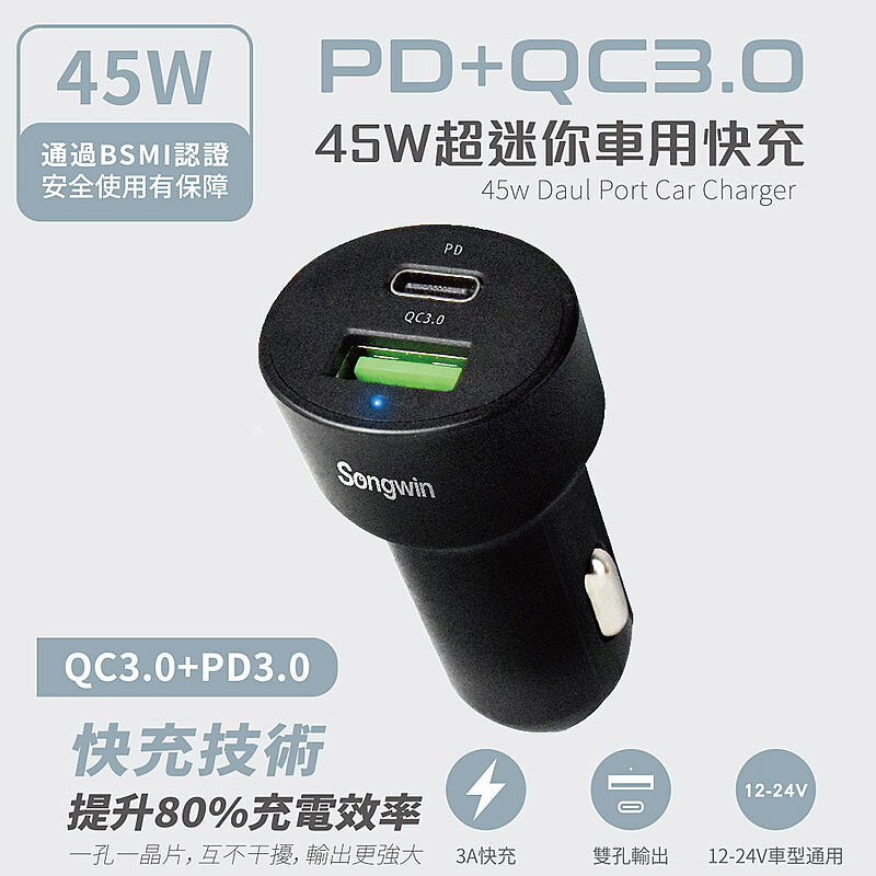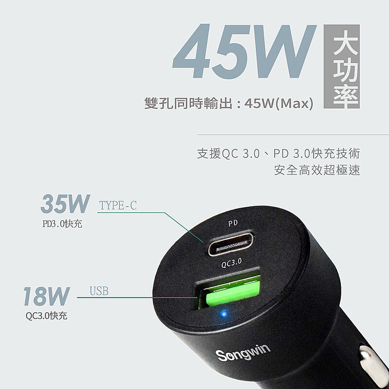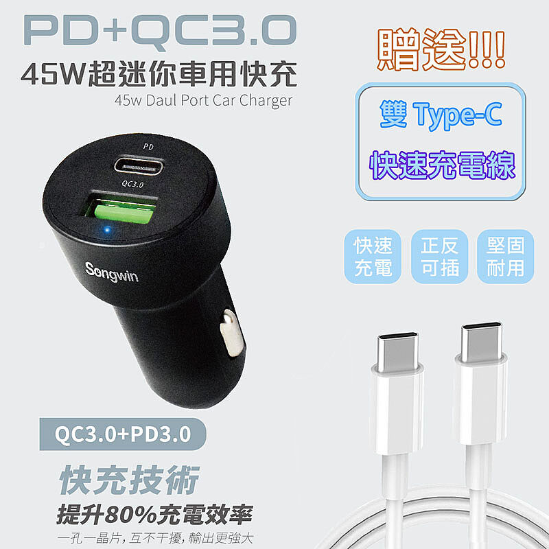Songwin 急速45W 超迷你快充PD+QC車載充電器/車充(附贈Type-C充電線)