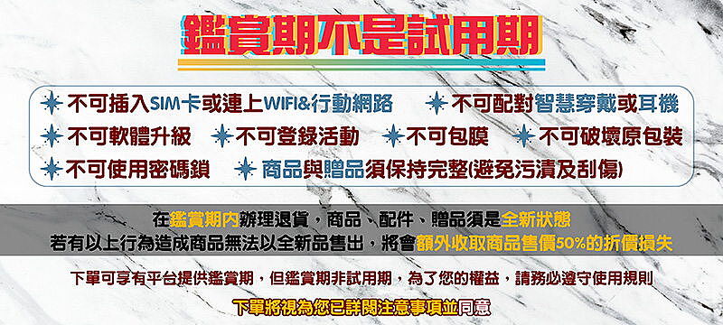 ※行動商品連結網路即會回傳序號至原廠伺服器即完成開通保固,開通日即是保固起始日,商品退貨若經查詢已開通保固或註冊登錄原廠活動,則是減損新品價值,本公司將會收取商品售價之50% 新品價值減損之整新費用。