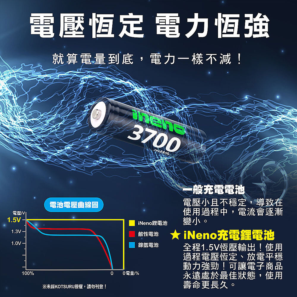 ineno鋰電池適合使用大電流要求的電器產品,恆壓電池電量用完前電力並不會減弱。可充達1500次並無記憶效應,也不會漏液並不含鉛汞的環保安全電池可安心使用。