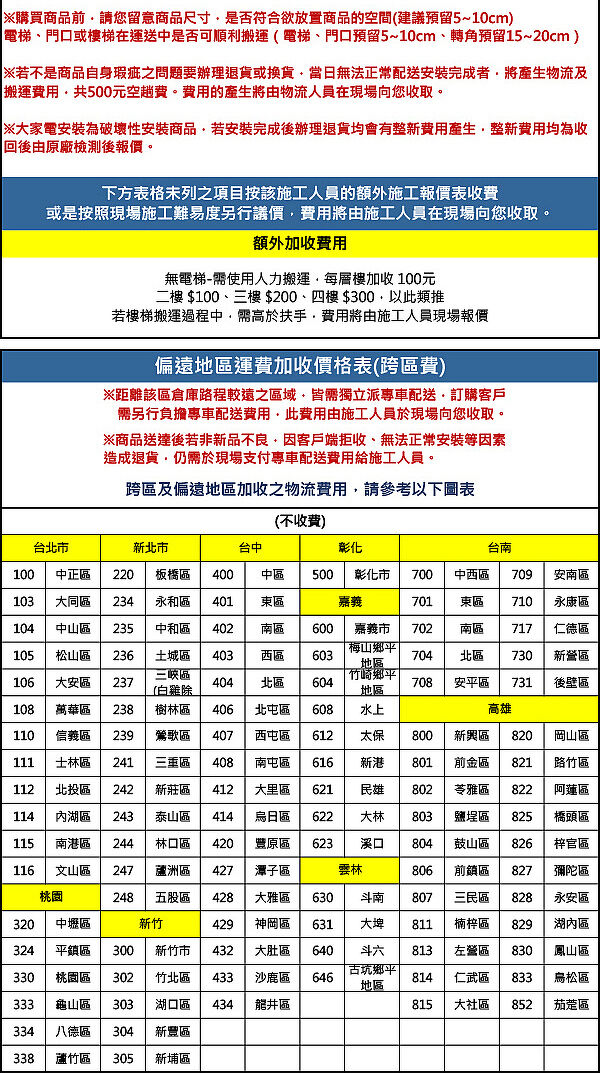 7.僅限台灣本島配送,若安裝或配送地區屬偏遠鄉鎮地區,則需酌收偏遠費用,所產生之費用由師傅現場收取現金,偏遠地區定義及費用依各別廠商通知為主,若有疑慮請先諮詢。