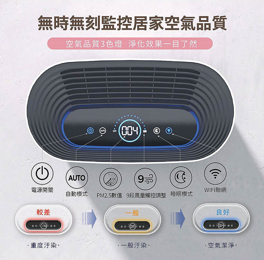 ◎自動偵測:PM2.5,三段顯示燈(紅/黃/藍)