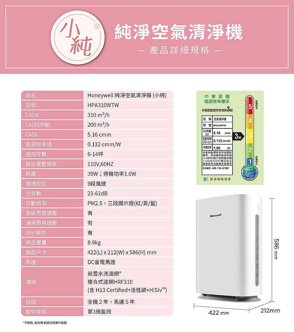 HEPA 13級濾網四重過濾 CASR 3.83 一級能效 WIFI智能遠端遙控