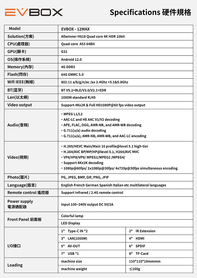 .I/O(介面):Type-C IN*2、IR Extension*1、LAN(1000M)*1、HDMI*1、AV-OUT*1、SPDIF*1、USB*1、TF-Card*1