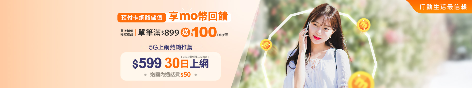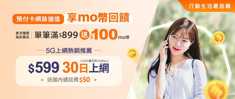 1. 【預付卡網路首儲享mo幣回饋】:本國籍預付卡用戶於活動期間2026/3/1~2026/4/30單月首次儲值國內上網產品(含計量型、計日型及雙享包),單筆滿$899送$100 mo幣,每門號每月限贈乙次。