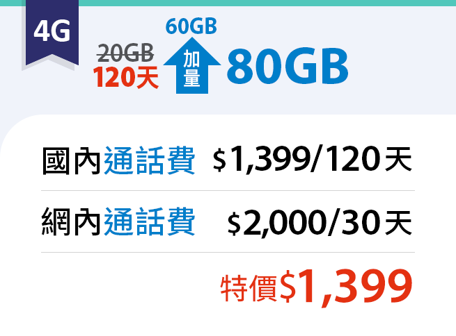 3. 新4代上網儲值包20GB贈送國內通話費$1399/效期120天及贈送網內通話費$2000/效期30天、5G上網儲值包60GB贈送國內通話費$100/效期60天。「贈送網內通話費」於效期內限制國內網內門號撥打數量100門;若撥打網內門號超過100門時,將依預付卡門號選用資費計算並直接扣抵通信費餘額;若無餘額通信費可抵扣,將無法使用。「贈送國內通話費」於效期內可折抵國內語音(網內、網外、市話、語音加值)及國內影像電話,但不包含縣市政府便民服務專線(1999)。以上贈送國內/網內通話費餘額不得退費、轉至其他台灣大哥大門號使用或為其他請求,並限於門號無「通話可用餘額」時使用,逾門號使用期限時歸零。