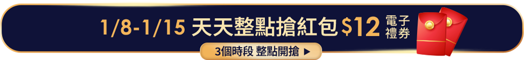 - 1/8~1/15活動期間內,指定時段(12:00、15:00、18:00)於活動網頁登入進行搶紅包電子禮券活動,即可獲得$12 myfone online贈品電子禮券,每時段限量。