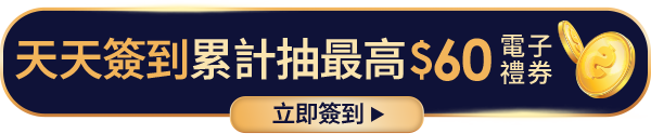 獎項說明:每日00:00~19:59前簽到完成,贈品電子禮券將於隔日匯入得獎者帳戶(舉例:1/16 11:50簽到將於1/17收到);20:00~23:59之間簽到則於再次日後匯入得獎者帳戶(舉例:1/16 20:30簽到,將於1/18收到)。有效期限為匯入日後5天內,逾期未使用完畢即失效,且不得作轉讓/延遲/折現或為其他請求。