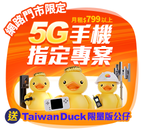 1. 2025/10/1起於myfone網路門市新申辦/攜碼/續約5G月租799型(含)以上指定手機專案,即可獲得「Taiwan Duck 限量版公仔」,企客專案、自由選及好速專案不適用此優惠。