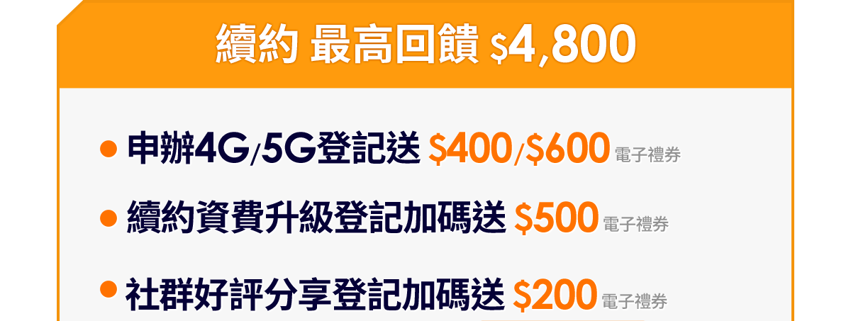 - 申辦4G/5G專案,且續約資費不低於前約資費,登記送$400/$600 (myfone online電子禮券)。