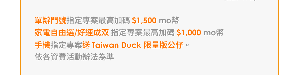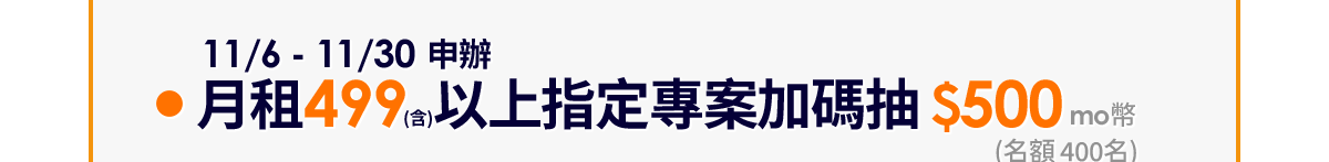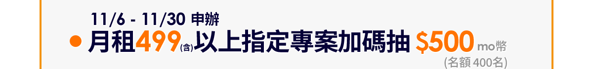 活動說明:活動期間內於活動通路申辦指定專案【單門號、手機案、自由選、好速成双(需符合網路門市申辦供裝區域)】,依申辦指定資費條件即可獲得回饋及參與登記加碼資格(詳獎項說明),符合活動登記資格用戶需於指定登記時間完成登記,逾期視為放棄,全月申辦電信方案加碼活動限量登記名額前10名。