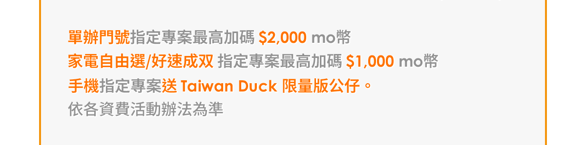 - 指定專案最高加碼$2,000 mo幣,依各資費活動辦法為準。