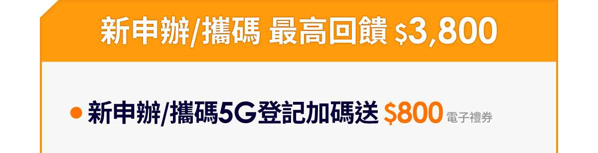 - 新申辦(含攜碼) 5G專案,登記送$800 (myfone online電子禮券)。