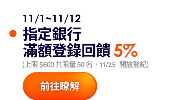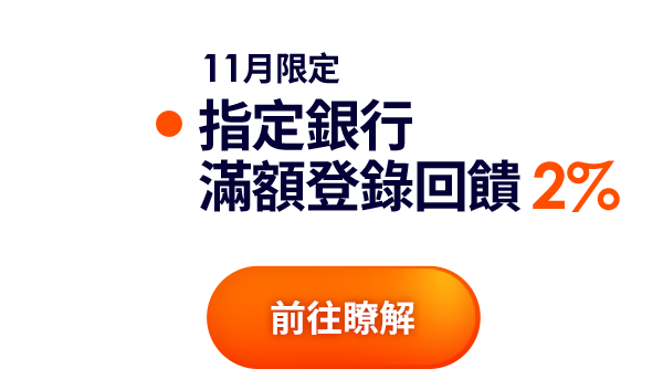 - 指定銀行刷卡滿額最高回饋5%,詳情請參考活動頁 。